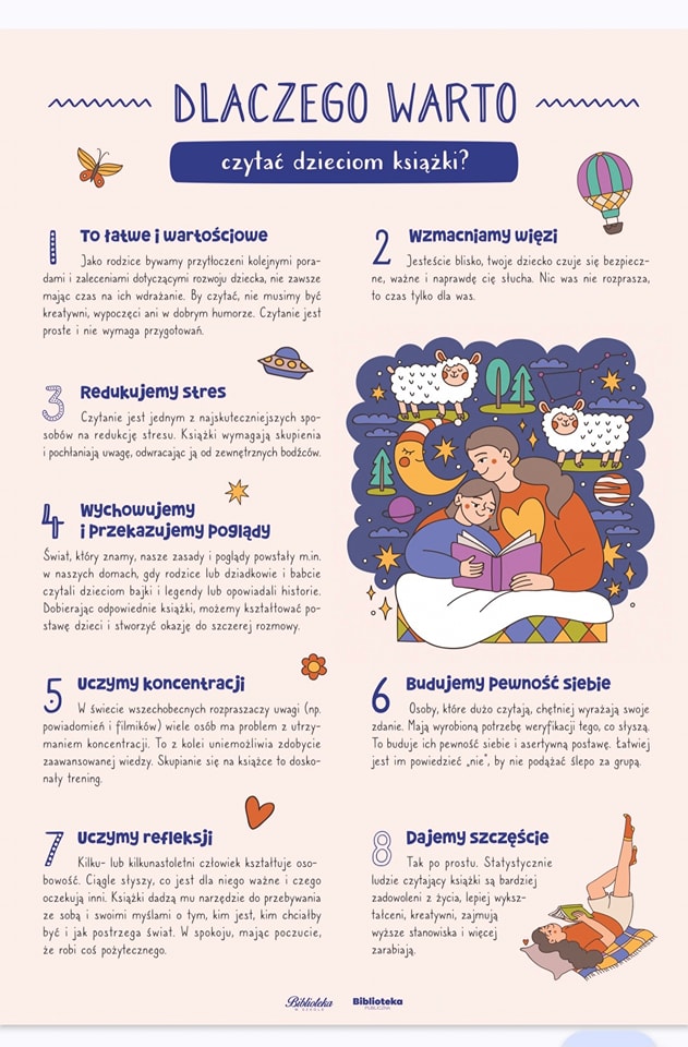 W ramach ogólnopolskiego programu „Biblioteka - Dobre miejsce dla człowieka”, promującego czytanie oraz aktywność i wizerunek bibliotek, biblioteka zaproponowała udział w akcji „Poczytajmy sobie” naszym najmłodszym czytelnikom. Propozycja ma na celu zaangażowanie rodziców do edukacji czytelniczej poprzez zorganizowanie swego rodzaju porozumienia z biblioteką. Głównym skutkiem ma być oczywiście wychowanie kolejnych czytelników. Poszukując jak najbardziej efektywnych działań promujących czytelnictwo, zaczynamy od podstaw, czyli przekonania rodziców, że czytanie książek to kluczowy element rozwoju ich dzieci.